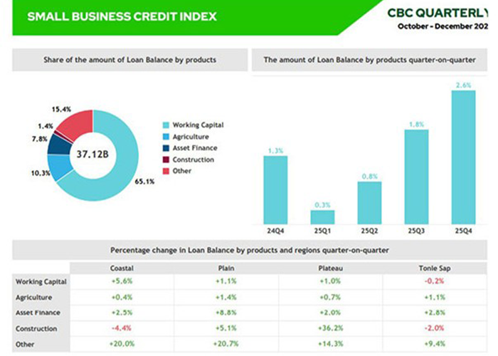 该报告涵盖202510月至12月期间,数据显示,贷款总额环比增长2.6%,主要由营运资金贷款推动,营运资金贷款占未偿贷款总额的65%以上。这凸显了在成本压力和需求不确定性的双重压力下,柬埔寨中小企业仍然依赖短期融资来维持日常运营。